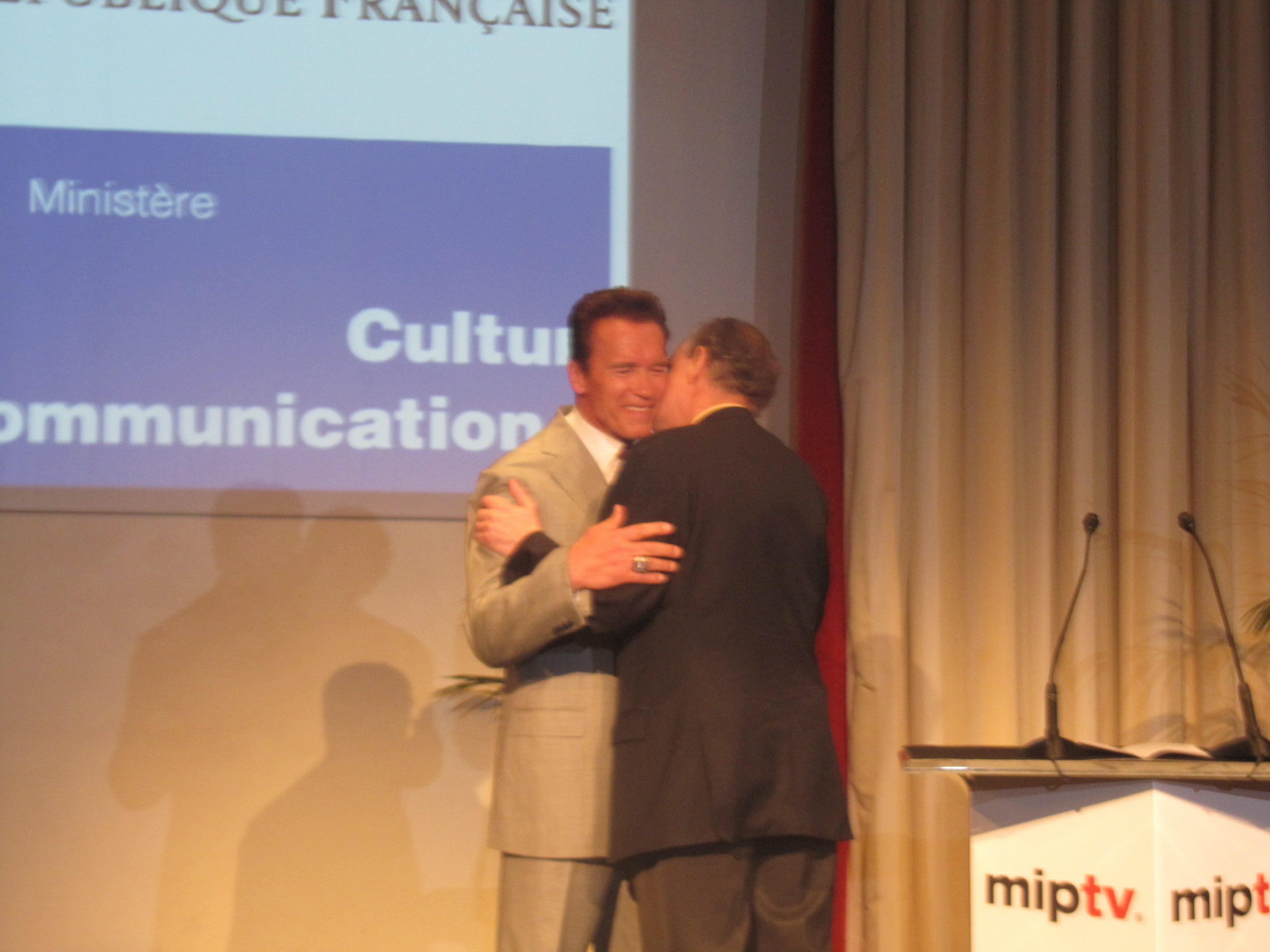 Tantôt Terminator tantôt Gouverneur Arnold SCHWARZENEGGER était à Cannes pour « vendre » sa série au MIPTV mais aussi pour recevoir une très haute distinction française, la Légion d’honneur des mains de Frédéric MITTERAND.