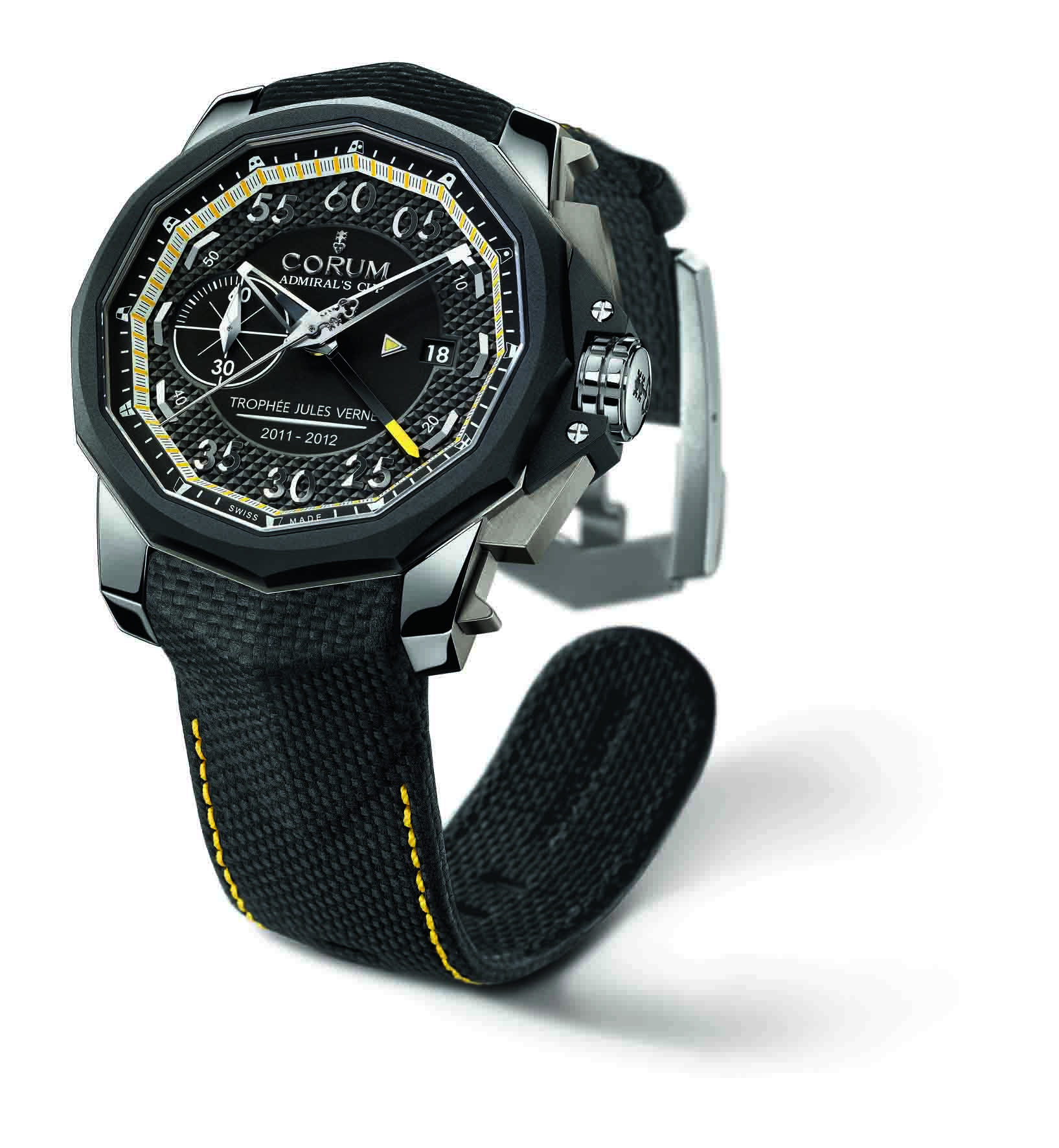 En tant que Chronométreur Officiel, Corum offre à chaque équipier une montre dédiée, l’Admiral’s Cup Seafender 48 Chrono Centro, personnalisée à leur nom. Le modèle arbore une inscription Trophée Jules Verne 2011 – 2012 sur son cadran, tandis que le dos de la pièce est décoré d’une gravure du tracé du parcours.
