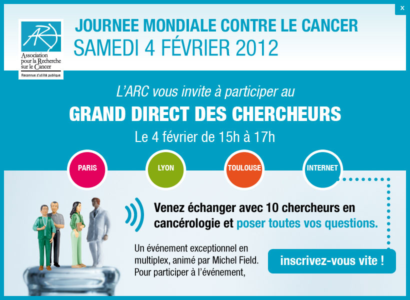 À l’occasion de la Journée mondiale contre le cancer, qui se tient le 4 février 2012, l’ARC lance, pour la troisième année consécutive, le « Grand Direct des Chercheurs ». Organisé simultanément à Paris, Lyon, Toulouse et retransmis sur Internet, ce rendez-vous permettra au grand public d’avoir un échange direct avec des chercheurs de renom et de partager avec eux les avancées, les perspectives concrètes et les espoirs dans la lutte contre le cancer.