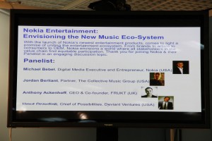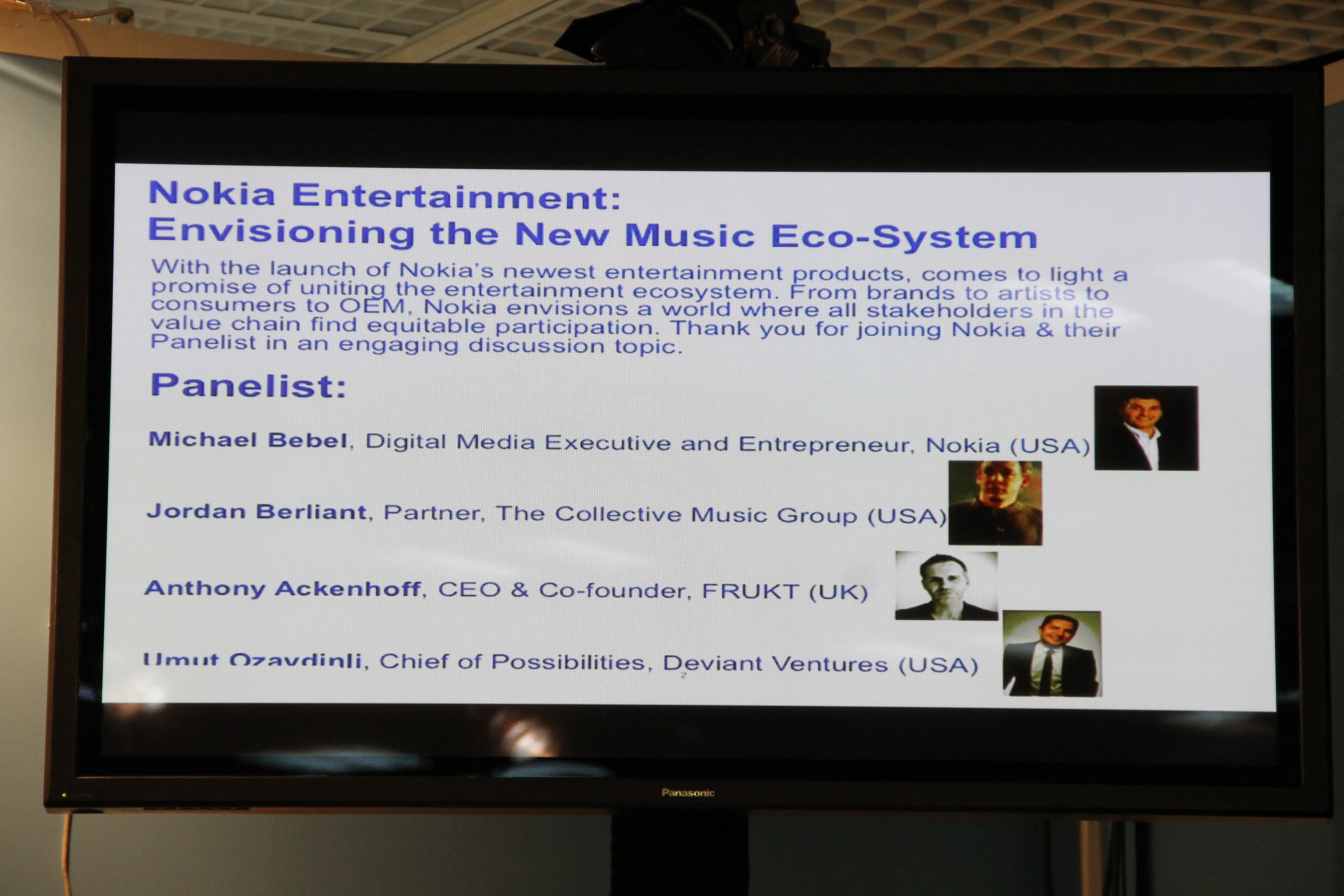 Michael BEBEL Directeur Digital Media chez NOKIA (USA), en présence de Jordan BERLIANT partenaire, de « Collective Music Group » (USA), Anthony ACKENHOFF Directeur et co-fondateur de FRUKT (UK) et Umut OZAYDINLY Chef des Possibilités chez « DEVIANT VENTURES » (USA) est venu nous présenter le lancement des produits du divertissement chez