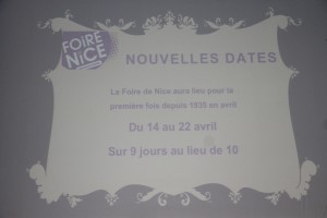 Ce changement de date et de réorganisation de lieux est dû à la présence, à Nice, en Mars, du Championnat du Monde de patinage artistique au moment où devait se dérouler la Foire de Nice en ce même endroit.
