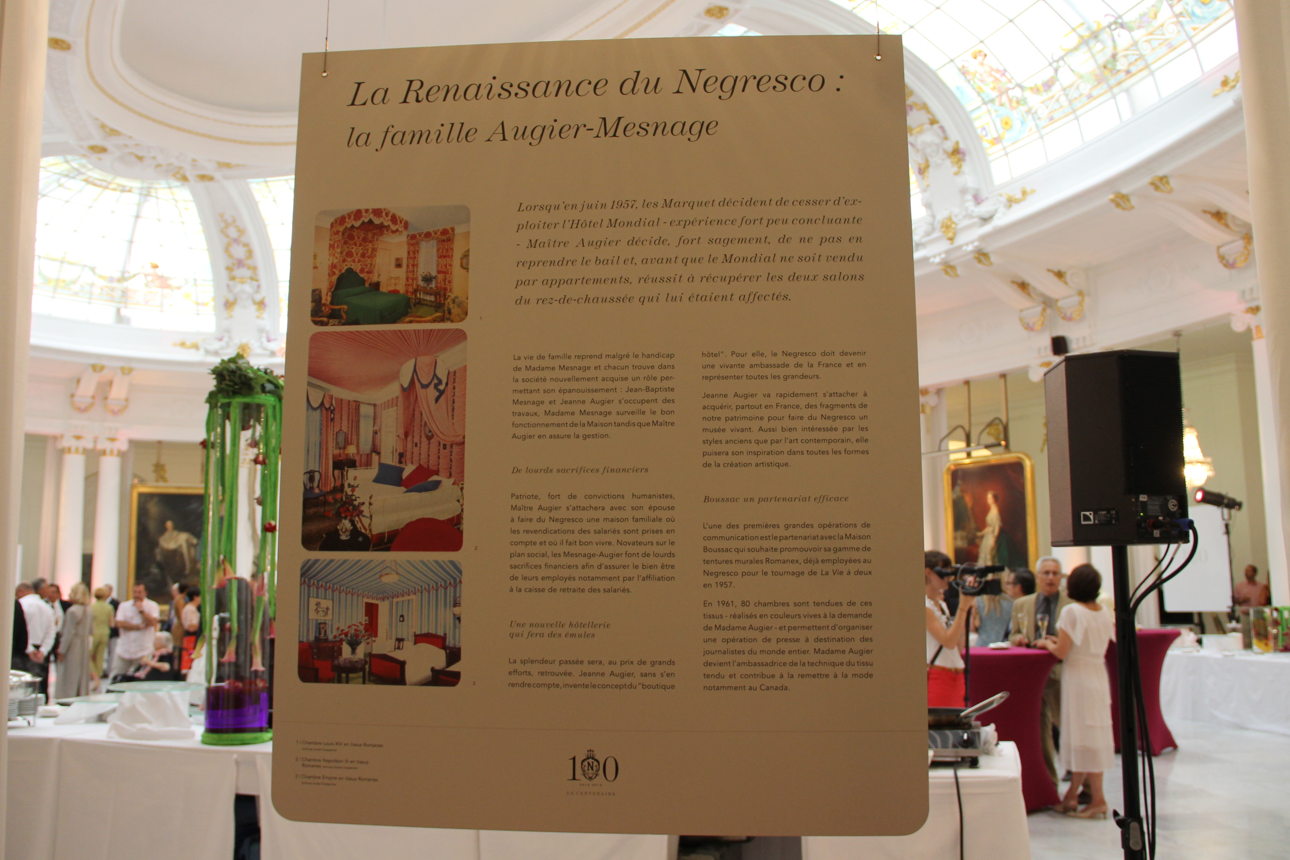» Je suis très heureux et fier de vous présenter ce soir « l’exposition 100 ans toute une histoire », cette exposition, fruit de nombreuses recherches, n’aurait pu être réalisée sans l’engagement plus personnel de la Maison NEGRESCO et des descendants de plusieurs familles célèbres de l’histoire de l’Hôtel. Je remercie tout particulièrement Nicole CAULIER arrière-petite fille d’Henri NEGRESCO, Paul ALETTI et Françoise de TARNOWSKI pour leur aide précieuse et je rends hommage à Henri NEGRESCO, Alexandre LAROQUE, Jean-Baptiste MESNAGE, Paul AUGIER »…