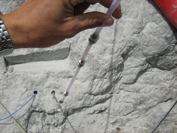 Installation d’un capteur de déformation à fibre optique dans la roche. © Géoazur