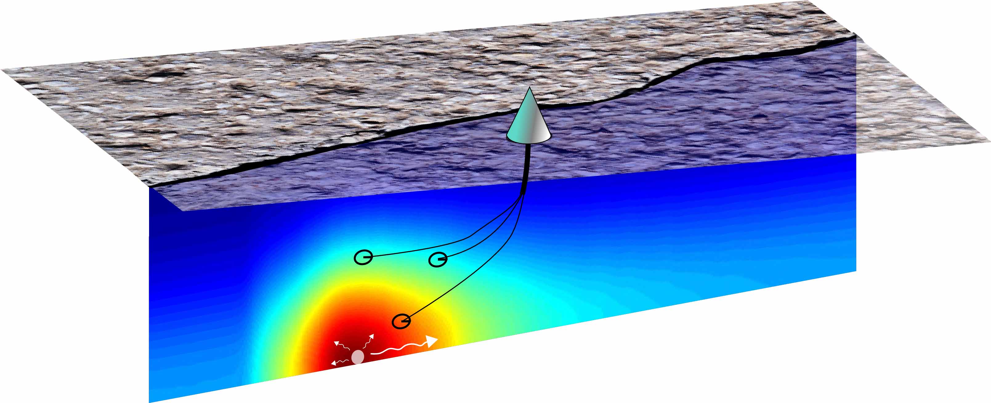 Simulation de la diffusion des fluides dans une faille tectonique équipée de capteurs (cercles noirs) en profondeur. Le cercle blanc est la source d’émission des fluides et le panache de couleurs correspond au champ de pression en mouvement. © Géoazur