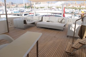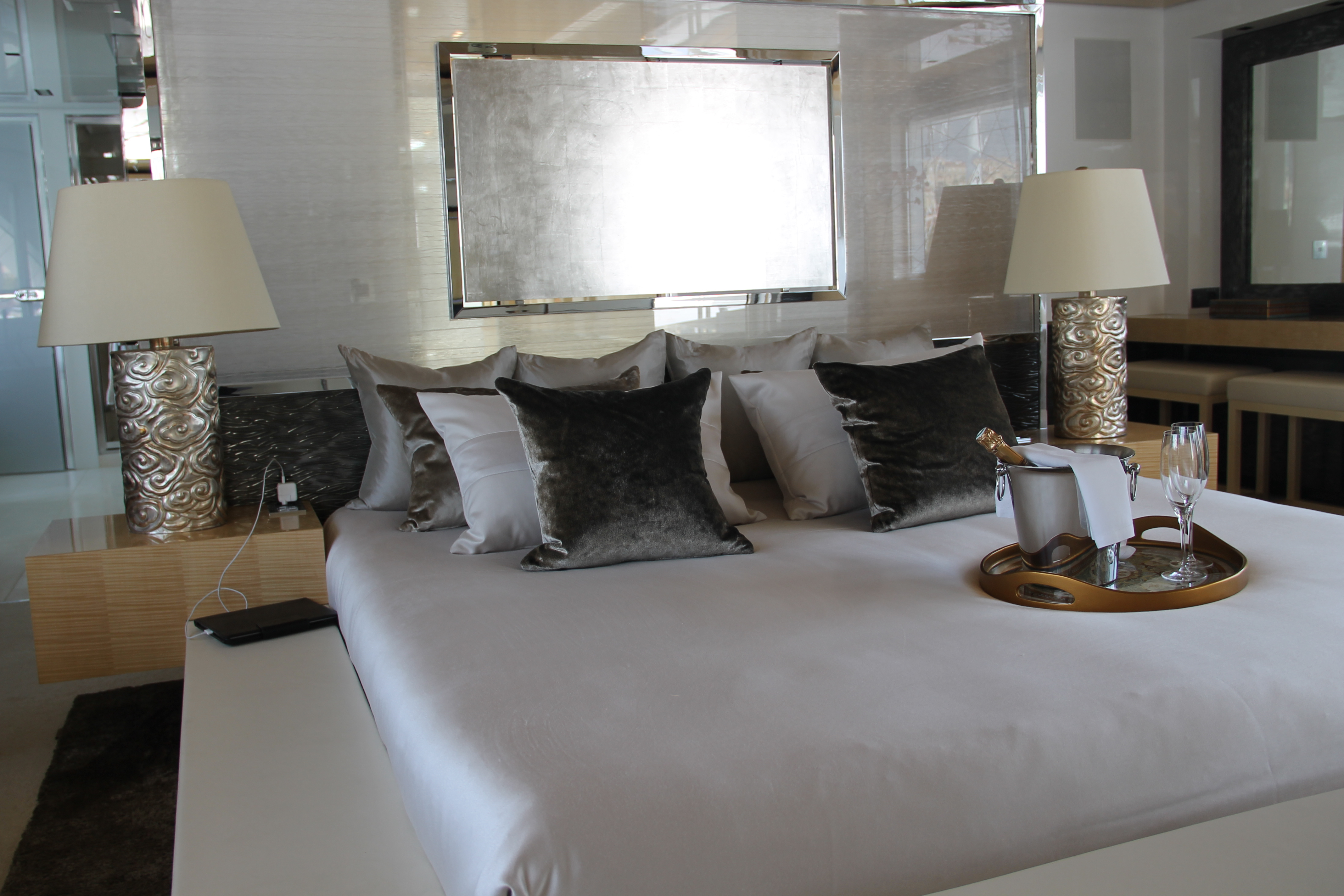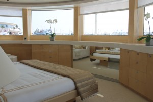 Avec ses 500 m2 habitables, le bateau peut accueillir 12 invités répartis dans 6 cabines avec un niveau de luxe extrême. La cabine armateur au pont supérieur bénéficie d’une vue panoramique et dispose d’un pont terrasse privatif, d’une salle de bain en marbre blanc équipée d’un hammam et d’un vaste dressing.