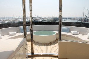 Deux cuisines (une froide et une chaude), un bar avec plancha, ou encore un jacuzzi de 6 places sur le pont supérieur et divers appareils de gymnastique viennent compléter l’équipement à bord. Les matériaux nobles se succèdent :