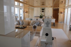 Le sol du salon est recouvert de cuir, les cloisons sont en bois de sycomore et laques blanches, habillées par des encadrements en chrome et inox poli.