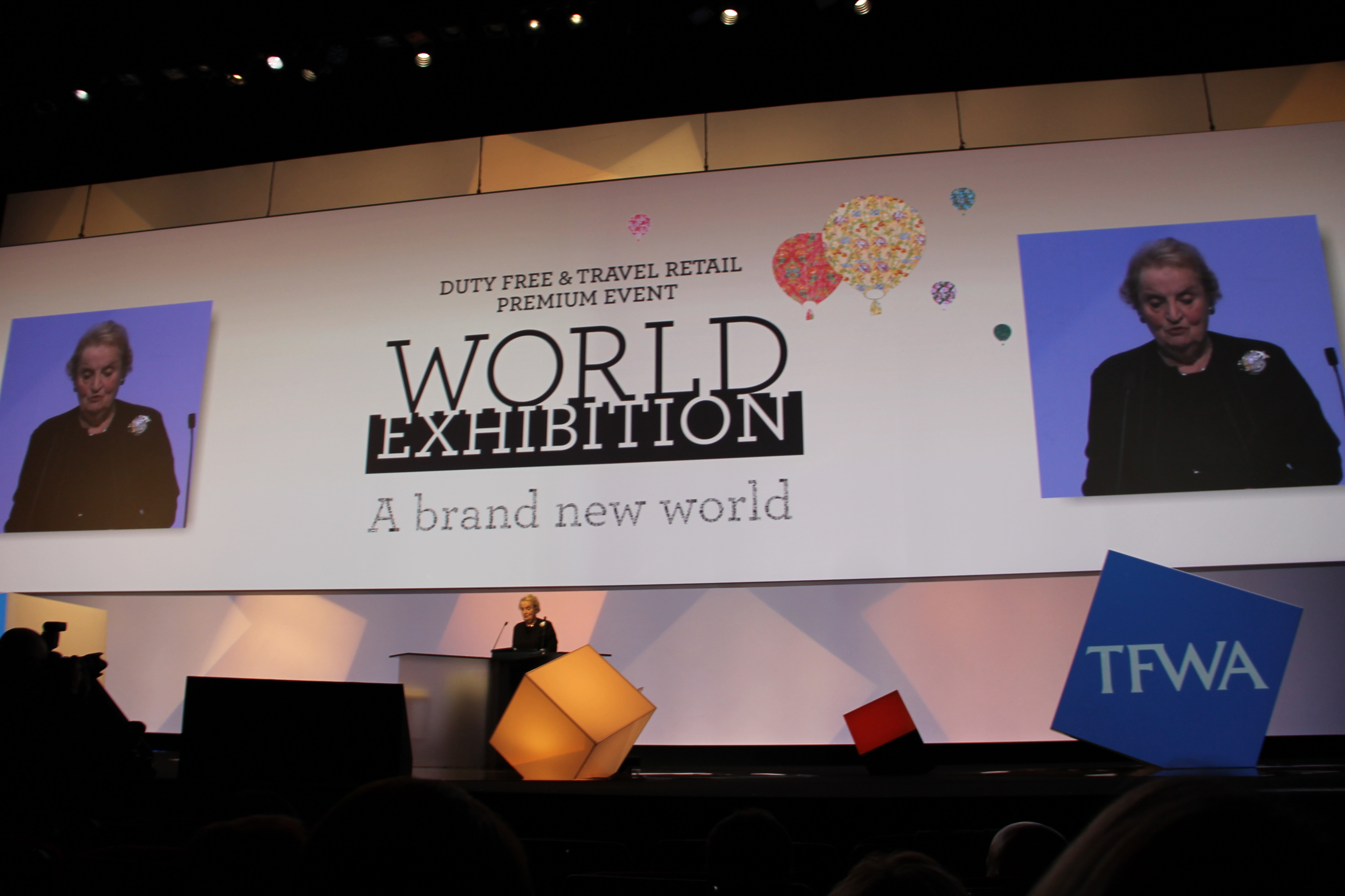 Lors de cette Conférence d’ouverture de TFWA World Exhibition, le conférencier Madeleine ALBRIGHT, ancienne secrétaire d’Etat américaine et Présidente de « Albright Stonebridge Group » et Erik Juul MORTENSEN, Président de TFWA étaient mis ensemble à l’honneur cette année.