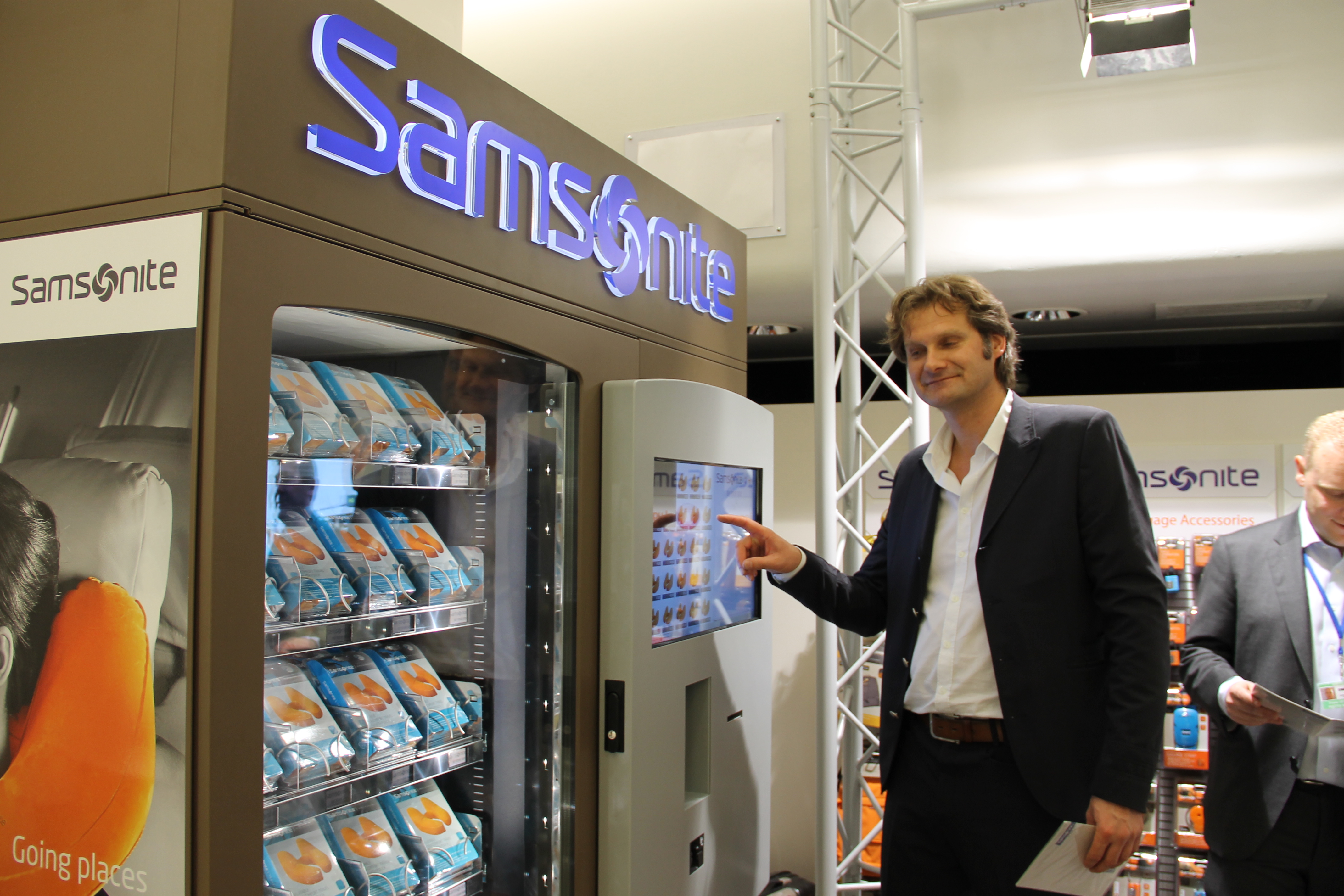 Un distributeur automatique Samsonite à écran tactile pour accessoires de voyage, comme : oreiller de voyage, visières, sangle pour bagages, cadenas, étiquettes à bagages etc. qui convient principalement aux achats de dernière minute. Gert Weyers, Directeur général de Samsonite France, de nous expliquer : « Notre distributeur automatique est une innovation, la société Samsonite a 102 ans, nous sommes présents et nous serons encore là dans 102 ans parce que nous continuons à innover dans toutes les parties de la société »…