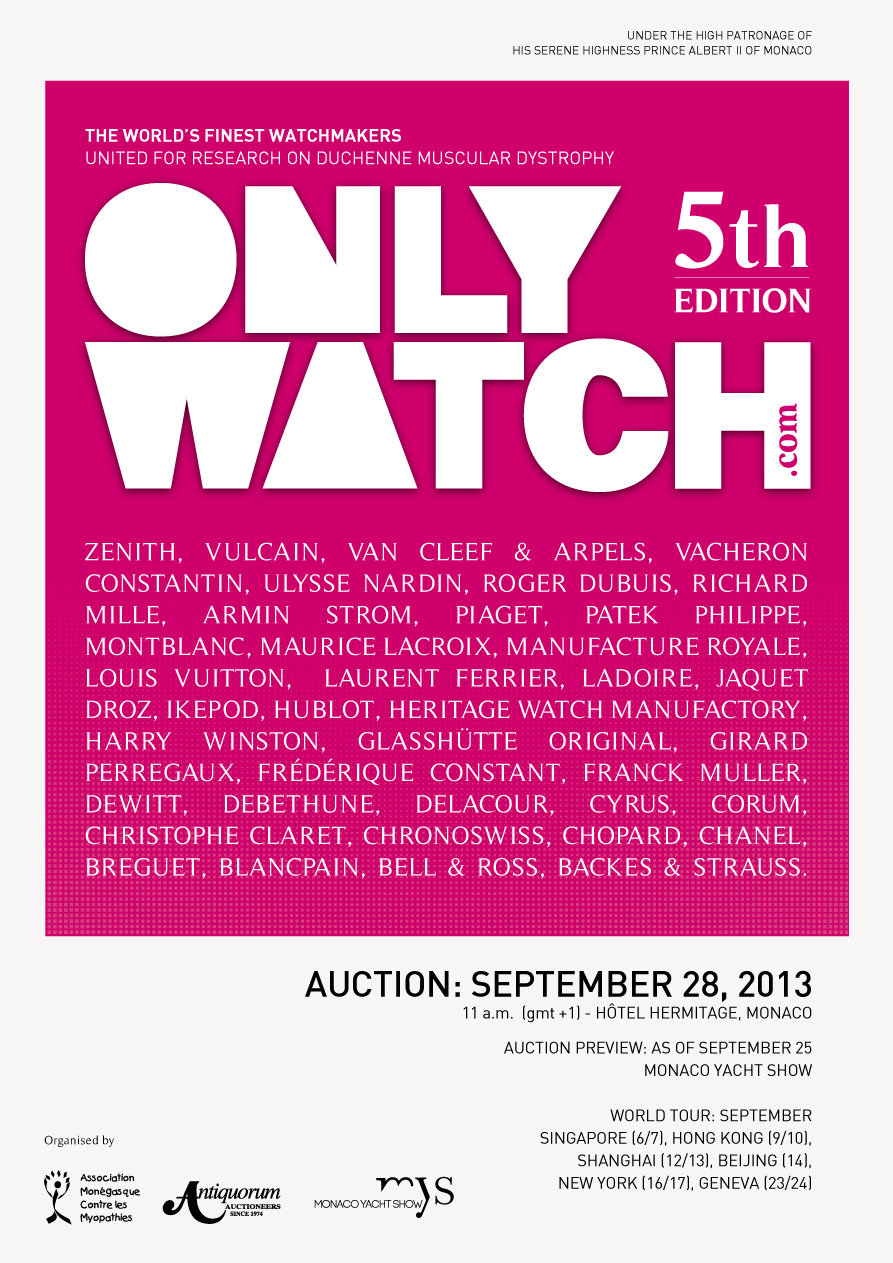 A compter du 6 septembre 2013, une exposition internationale de ces créations horlogères pour hommes et femmes, sillonnera le monde : Singapour, Hong Kong, Shanghai, Pékin, New York, Genève (informations complémentaires sur www.onlywatch.com à partir du 1er avril) et se conclura par une présentation dans l’enceinte du Monaco Yacht Show (25/28 septembre) puis par la vente le samedi 28 septembre à 11h (GMT+1) dans la salle Belle Epoque de l’Hôtel Hermitage.