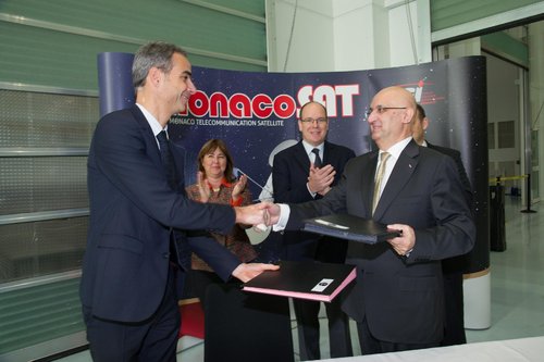 Monaco Telecom et SSI-Monaco ont signé à Cannes lundi 14 janvier 2014, en présence de SAS le Prince Albert II, un protocole d’accord dans les locaux de Thales Alenia Space, en charge de la fabrication du satellite MonacoSat. Cette signature vise à concrétiser l’interconnexion entre le futur satellite, qui occupera la position orbitale attribuée à Monaco, et les infrastructures et réseau terrestre de Monaco Telecom, accessible au travers de son Téléport.