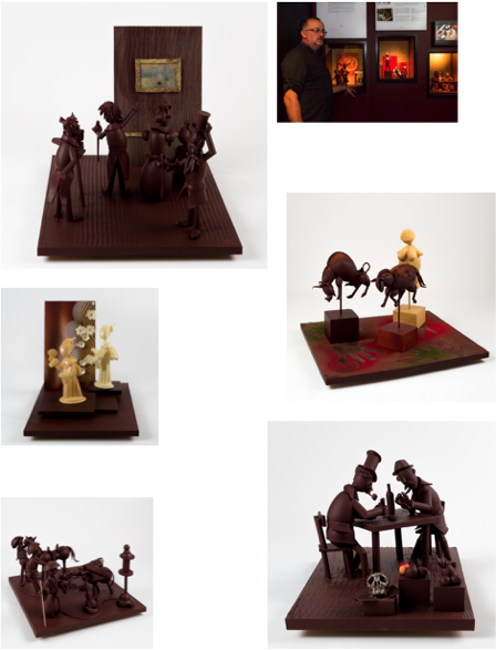 C’est en chocolaterie qu’il s’est réellement révélé comme le créateur d’extraordinaires personnages et saynètes montés en chocolat. Initié par son père à cette technique, il ne cesse de la parfaire en donnant libre cours à son imagination.