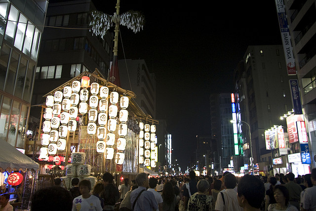 Tous les ans, autour du sanctuaire Yasaka-jinja, dans le quartier de Gion à Kyoto, une trentaine de chars (les yamaboko) paradent dans les rues ornées de fleurs et de tentures colorées, illuminés par des lanternes, et tractés par des centaines de porteurs.
