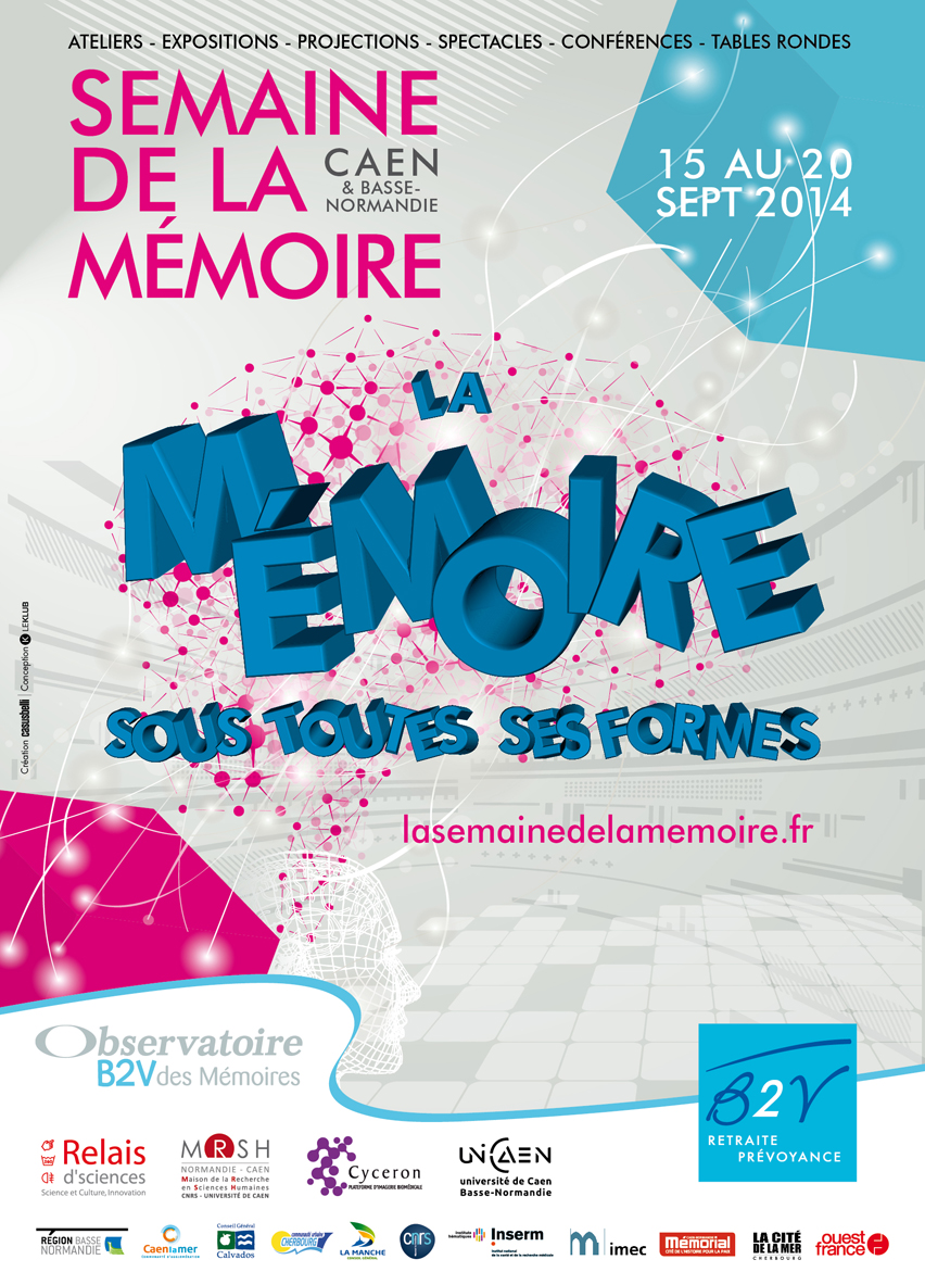 DU 15 AU 20 SEPTEMBRE 2014, EN MARGE DU XIIIEME COLLOQUE INTERNATIONAL SUR LE VIEILLISSEMENT COGNITIF QUI VA RÉUNIR LES PLUS GRANDS CHERCHEURS ET SCIENTIFIQUES ET A L’OCCASION DE LA JOURNÉE MONDIALE D’ALZHEIMER LE 21 SEPTEMBRE, L’OBSERVATOIRE B2V DES MÉMOIRES ORGANISE POUR LA PREMIÈRE FOIS EN FRANCE : LA SEMAINE DE LA MÉMOIRE AVEC LE SOUTIEN DE LA VILLE DE CAEN ET DE LA RÉGION BASSE NORMANDIE.