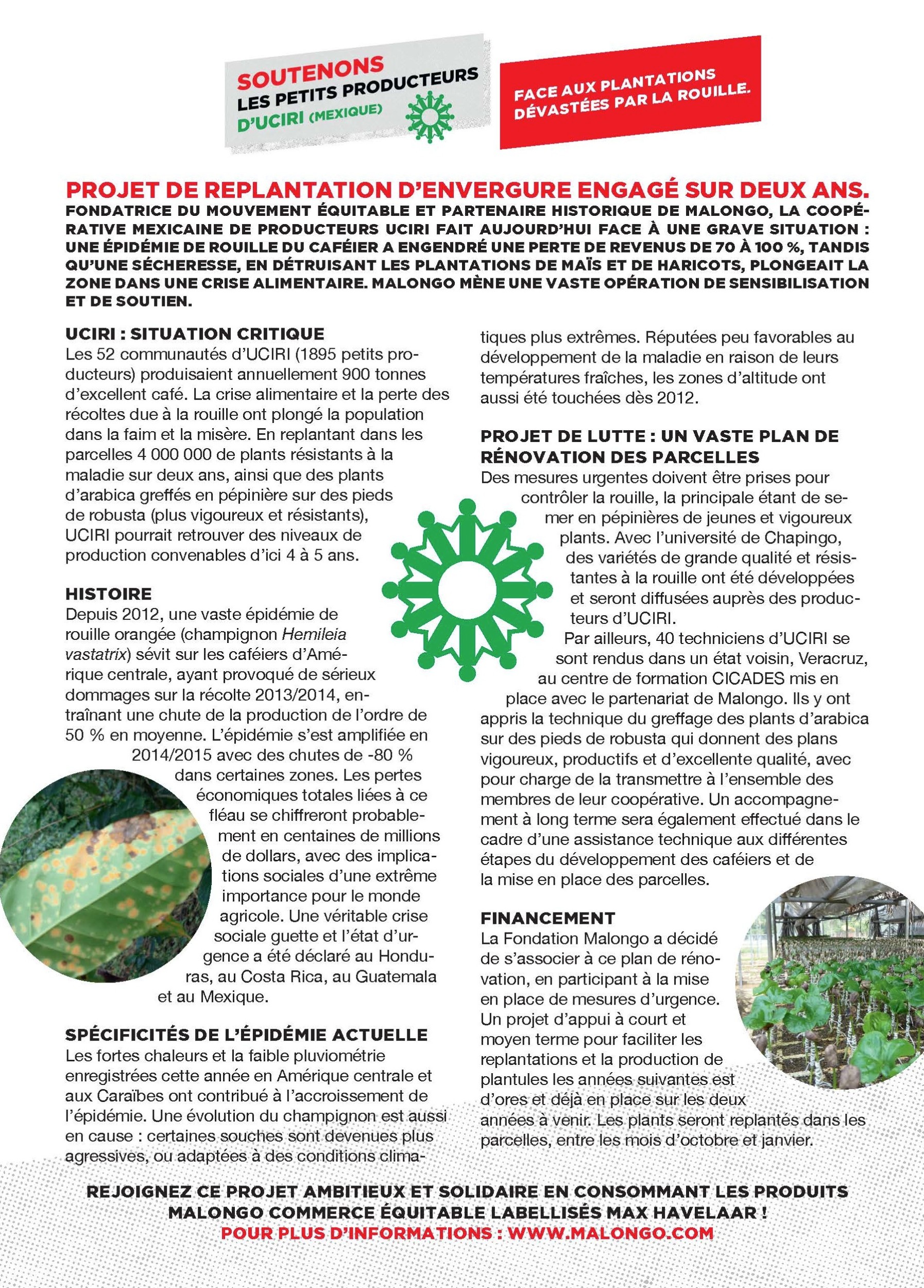 La coopérative mexicaine de producteurs UCIRI, fondatrice du mouvement équitable et partenaire historique de malongo, fait aujourd’hui face a une grave situation : une épidémie de rouille du caféier a engendré une perte de revenus de 70 a 100 %, tandis qu’une sécheresse, en détruisant les plantations de maïs et de haricots, plongeait la zone dans une crise alimentaire.