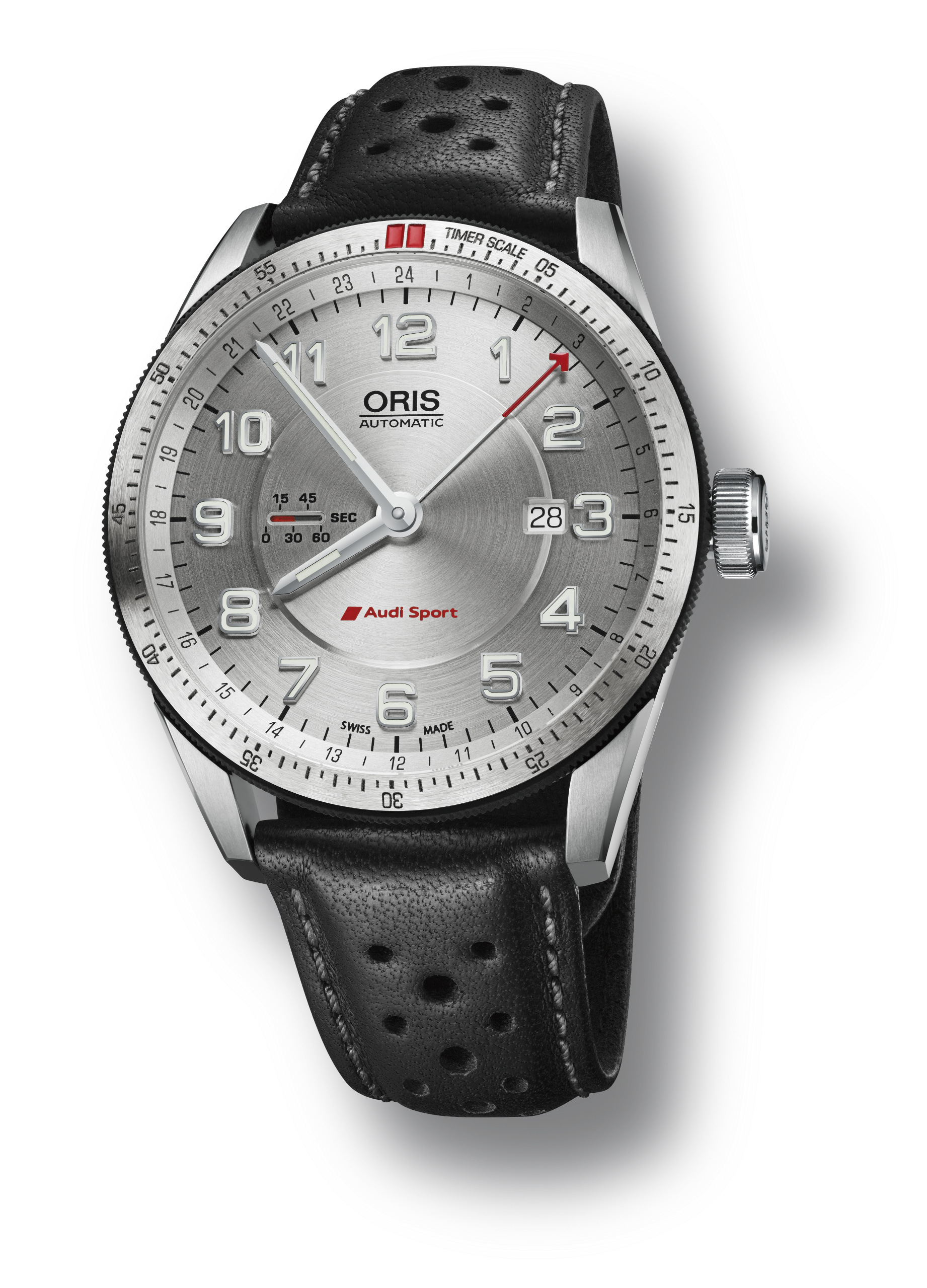 D’un diamètre de 44 mm, le boîtier multipièce en acier inoxydable, étanche jusqu’à 100 mètres, protège un cadran mat, évoquant le tableau de bord d’une voiture de course Audi et dont la teinte argenté rend hommage à la couleur signature de la célèbre marque aux quatre anneaux. Animé par le nouveau mouvement automatique Oris GMT, base Sellita SW 220-1, il affiche un second fuseau horaire au moyen d’une aiguille centrale à pointe rouge sur une graduation 24 heures disposée sur le pourtour du cadran.