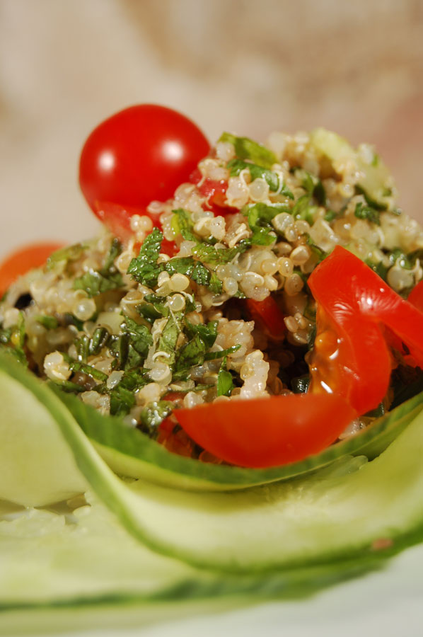 Pour contrer les grandes chaleurs, rien de mieux qu’une vinaigrette à l’huile d’olive pour accompagner des tomates cerises, des herbes fraîchement cueillies, de l’échalote, du raisin de Corinthe, et bien-sûr du quinoa. La salade de quinoa est le meilleur moyen de ne pas se cantonner à la fameuse « salade verte », et de voyager… par le goût.