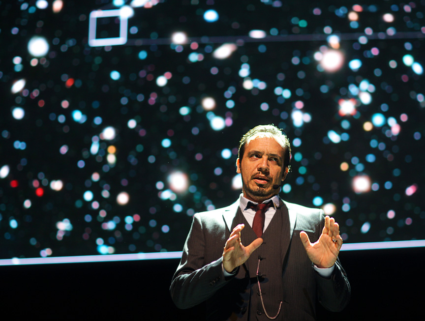 Car toutes les zones vides, tu les remplis avec des idées à toi et ça devient quelque chose de très sensuel. Le chemin que tu fais jusqu’à l’écriture, fait de compréhension et de rencontres avec des gens qui passent beaucoup plus de temps que toi sur ce genre de sujets, modifie ton fantasme et fait même en sorte que ça n’en soit plus un. C’est déstabilisant car tu perds cette chose sensuelle, et en même temps, quand je fais ça, j’acquiers une avance sur le public. Oui, je vis avec ça depuis toujours et, pour faire ce spectacle, j’ai fait tout ce que je n’avais jamais fait avant : je me suis plongé dedans avec la volonté de ne rien croire et j’y ai trouvé des choses plus hybrides, peut-être plus riches. Mais maintenant, il y a l’étude qui me sépare du fantasme. Je faisais partie de ceux qui étaient bouleversés par la possibilité d’une civilisation extraterrestre concomitante à la nôtre…