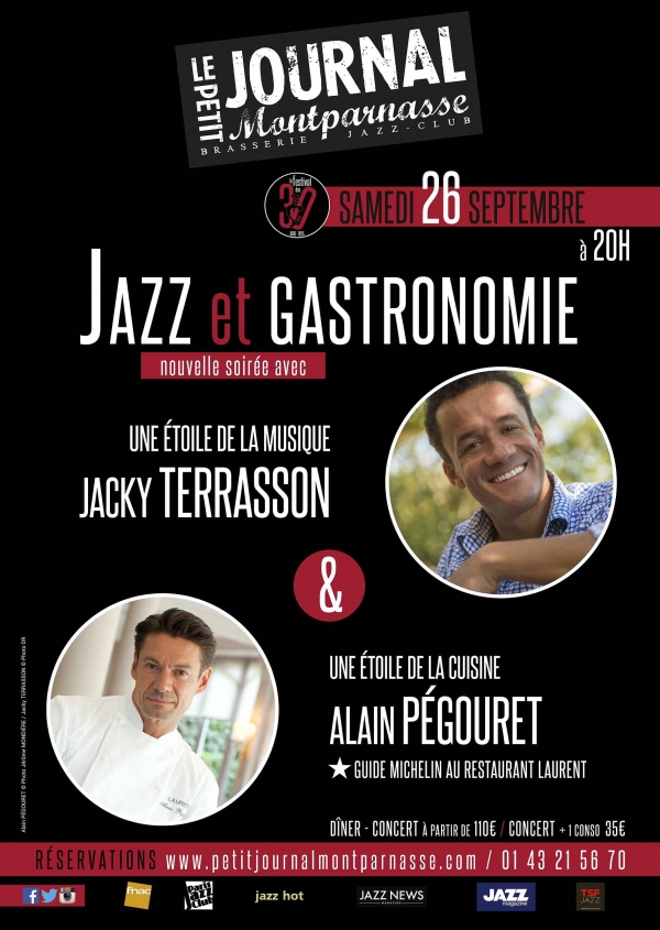 A l’initiative d’André ROBERT, Jacky TERRASSON rencontre le Chef de cuisine Alain PÉGOURET, pour un événement unique. Cette seconde édition assoit le projet « Jazz et Gastronomie » : associer gastronomie et musique pour faire ressortir le meilleur des deux univers, tant pour le public que pour les artistes.