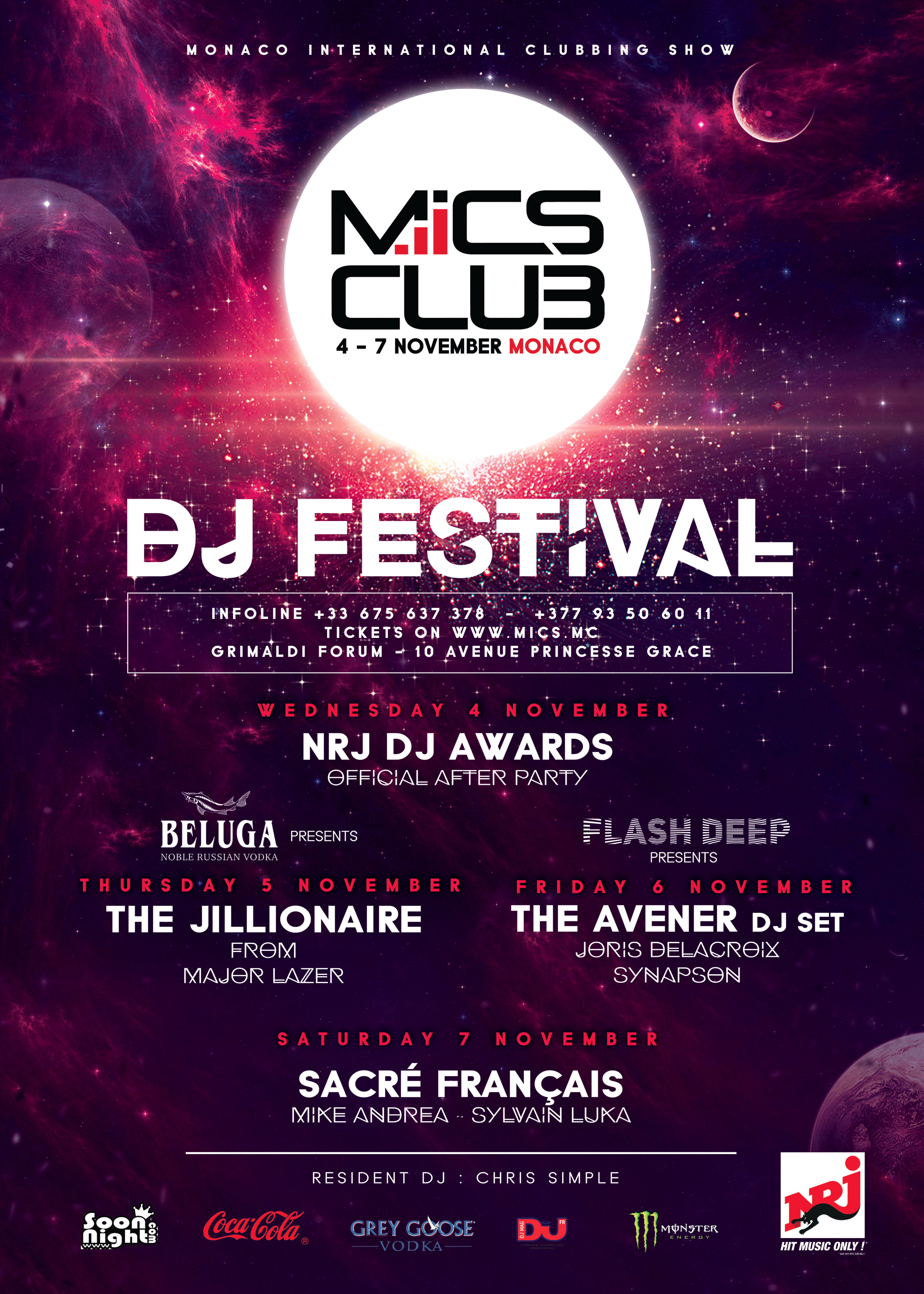 Rendez-vous donc les 4, 5, 6 et 7 novembre 2015 au MICS Club ; Tickets « DJ Festival » disponibles sur le site Internet du MICS : www.mics.mc.