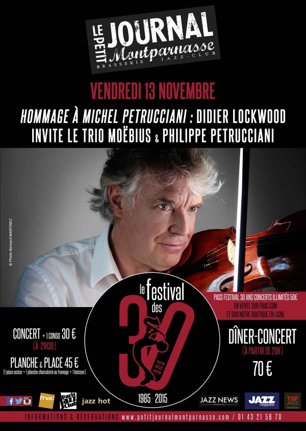 Dans le cadre du Festival des 30 ans du Petit Journal Montparnasse, l’organisation du Petit Journal Montparnasse a l’honneur d’accueillir le violoniste Didier LOCKWOOD, accompagné du Trio Moëbius et de Philippe PETRUCCIANI, pour un hommage à Michel PETRUCCIANI.