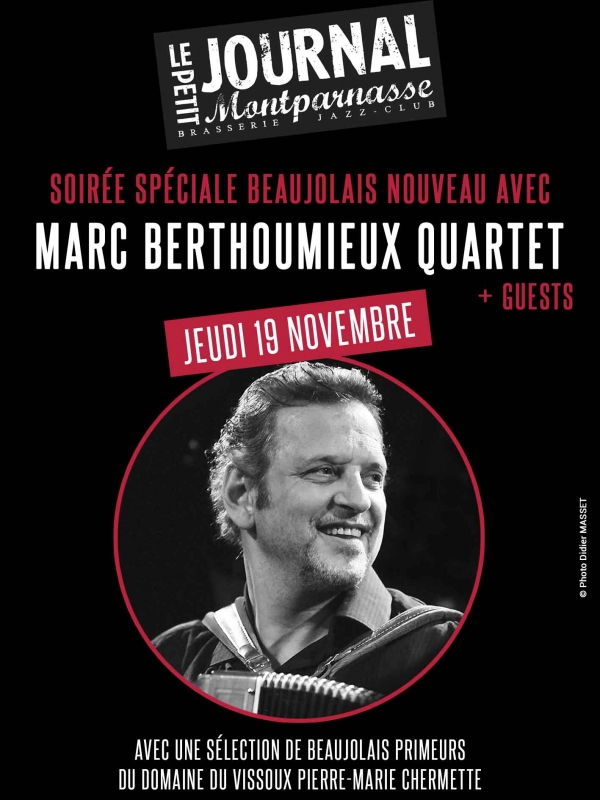 L’arrivée du Beaujolais Nouveau est synonyme de fête au Petit Journal Montparnasse. Et comme accordéon et vin font bon ménage… Nous accueillons l’accordéoniste Marc BERTHOUMIEUX !