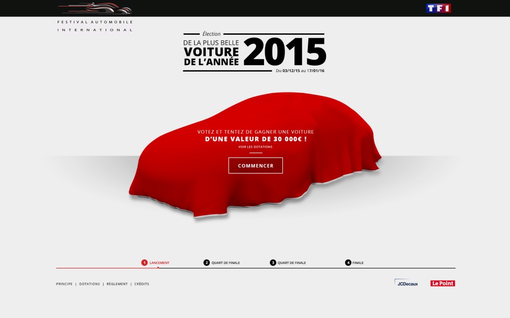 Cette année, l’élection sera relayée par le Groupe TF1 et un puissant dispositif de relai media national. Ce jeu concours permettra également aux internautes participants de remporter, après tirage au sort, une voiture d’une valeur de 30.000 € (prix public) offerte par le constructeur vainqueur de l’élection. La voiture gagnante sera révélée le 26 janvier 2016 lors de la cérémonie de remise des Grands Prix du Festival Automobile International.