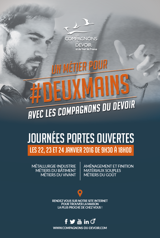 Choisir un métier, une formation ou un établissement sur le papier n’est pas facile. C’est bien pour cette raison que les Compagnons du Devoir, pour qui les valeurs de partage et d’échange sont fondamentales, ouvrent les portes de leurs Maisons réparties sur toute la France. Organisées du 22 au 24 janvier 2016* de 9h30 à 18h, ces Journées Portes Ouvertes donnent l’opportunité à des collégiens, lycéens et étudiants d’aller à la découverte des métiers.
