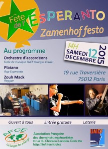 A Paris, la fête se déroulera le 12 décembre 2015 à 14h, au 19 rue Traversière (près de la gare de Lyon). Au programme : accordéons avec un groupe de l’école de musique cheminote, Platano (rap en espéranto), Zhou Mack (reggae), loterie.