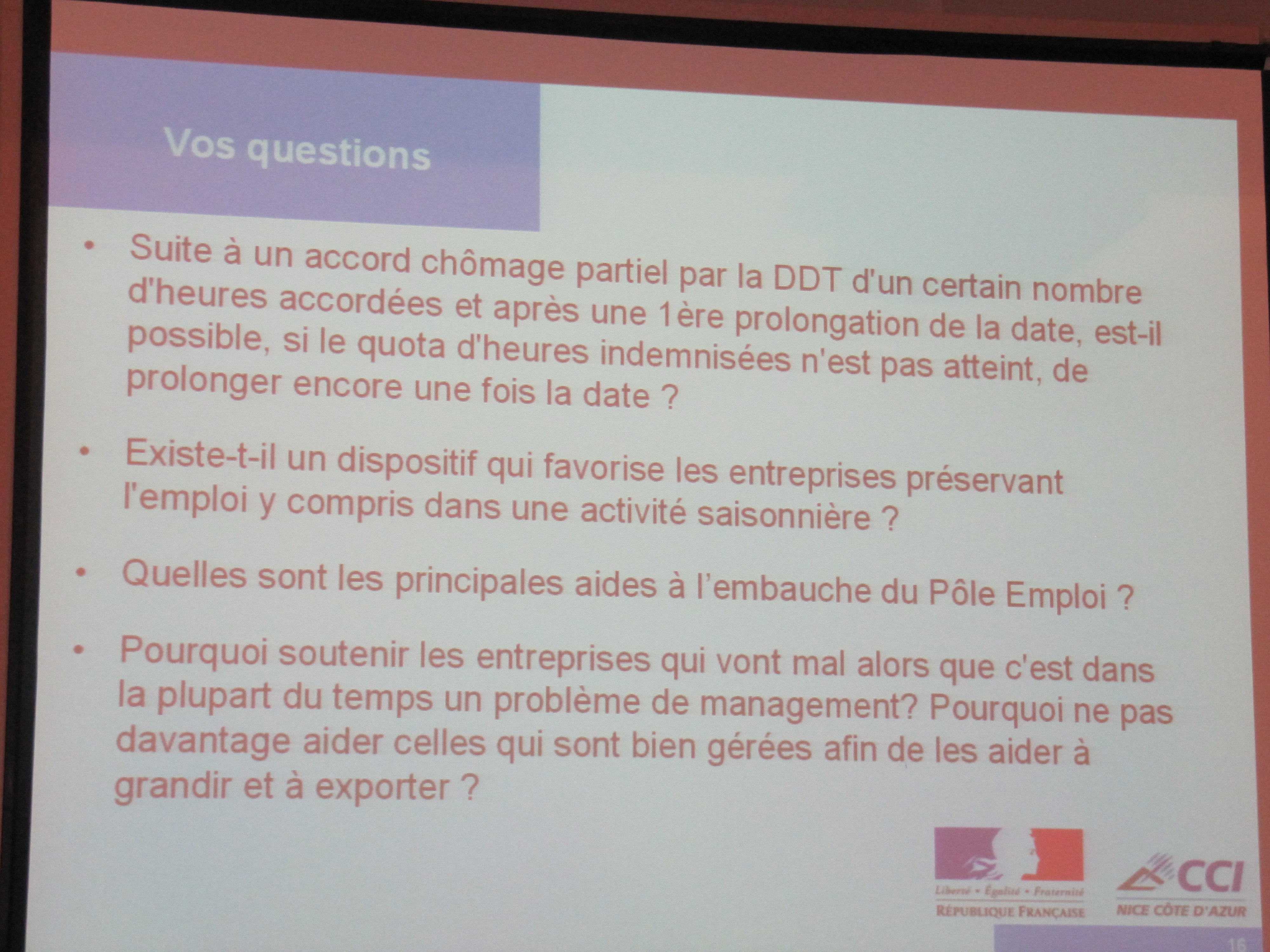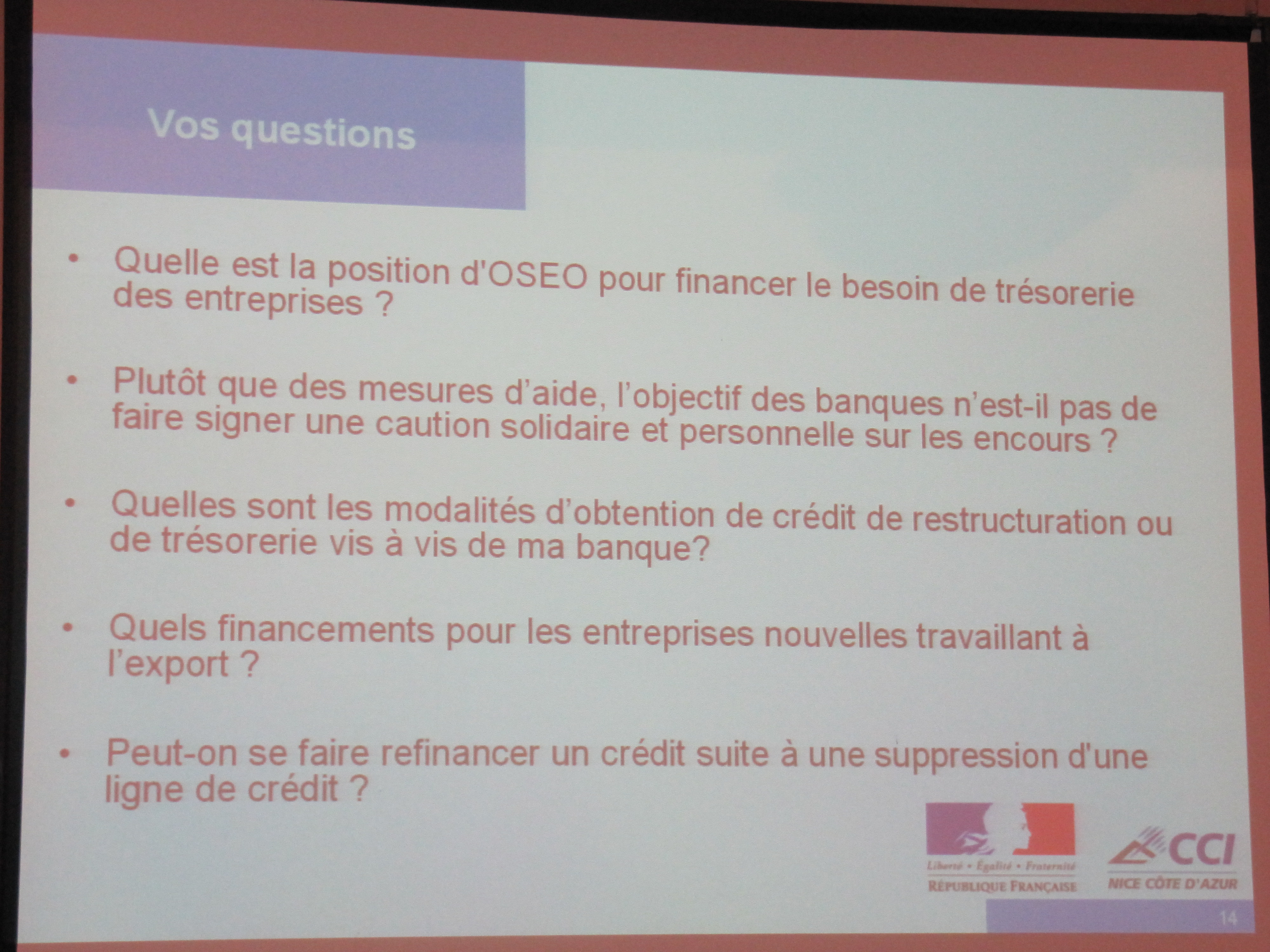 Des intervenants de « grande qualité » au service des entrepreneurs comme Patrick Berger, Directeur de la Banque de France, Olivier Vincent, Délégué Côte d’Azur OSEO, Bernard Guyat, Vice-Président du Comité des Banques des Alpes-Maritimes de la Fédération Bancaire Française étaient présents pour expliquer ces nouvelles dispositions.