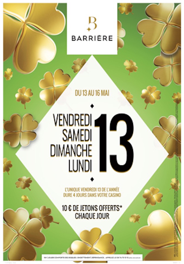 Pour l’unique « vendredi 13 » de l’année 2016, les Casinos Barrière offrent à tous les joueurs 10 euros de jetons par jour pour provoquer la chance ! Du 13 au 16 mai 2016, venez profiter de ces 4 jours exceptionnels pour défier le hasard dans tous les casinos du Groupe !