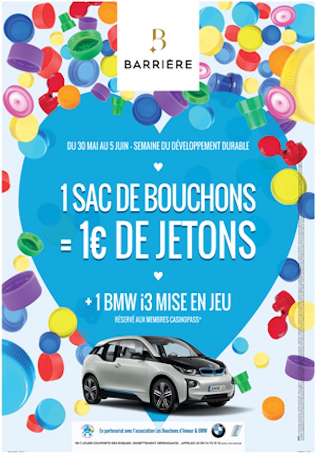 Du 30 mai au 5 juin 2016, à l’occasion de la Semaine Européenne du Développement durable, Barrière lance une nouvelle collecte de bouchons dans ses casinos, en partenariat avec l’association Les Bouchons d’Amour et BMW.