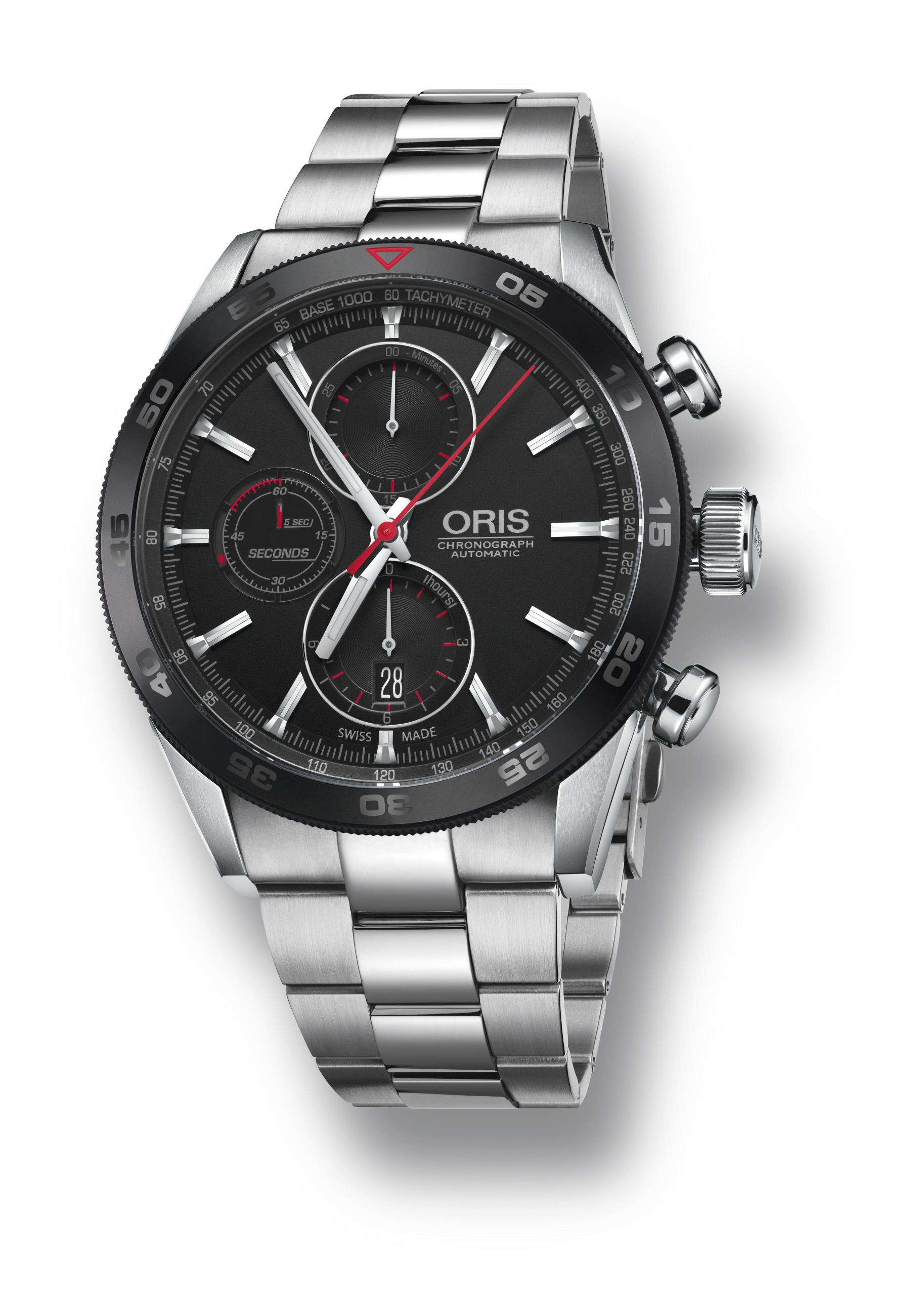 Oris afin de garantir une prise en main optimale et donc un ajustement plus précis. La montre est équipée, au choix, d’un bracelet en caoutchouc noir perforé esprit « racing » ou en acier inoxydable avec boucle déployante.