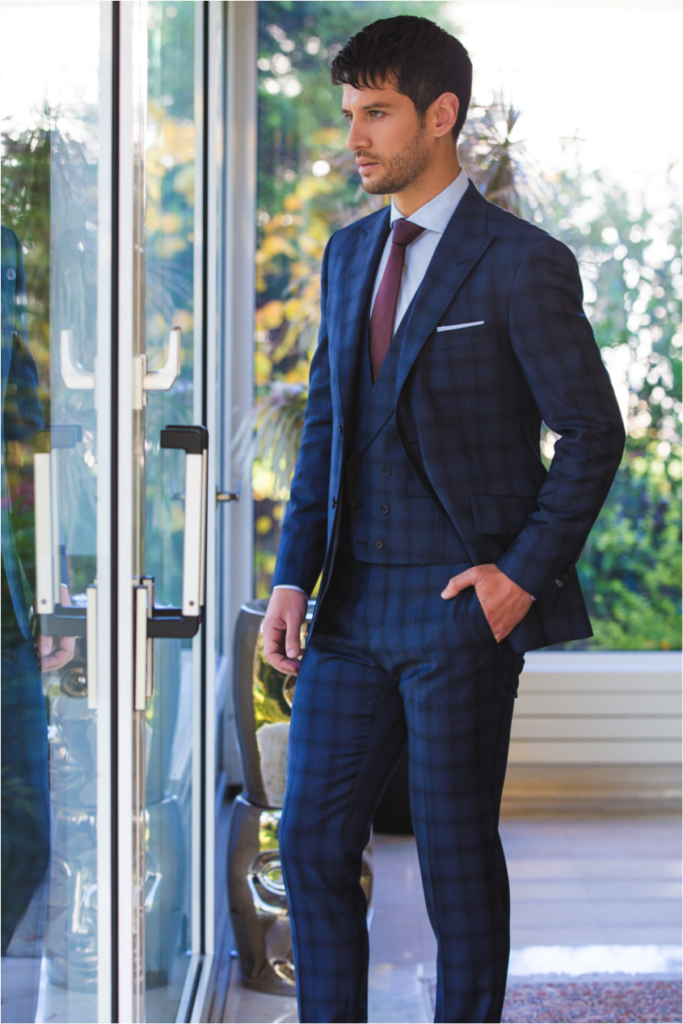 Le mois de Mars est aussi l’occasion de lancer le look du mois avec cette fois-ci un costume 3 pièces en tissu Reda 100% laine bien sûr. Cette grande maison qui a récemment fêtée ses 150 ans d’existence, a été sélectionnée avec un tissu 130’s aux motifs caviars et grand carreaux. L’effet visuel est original car totalement différent en fonction de la distance à laquelle on découvre le costume. La veste au col en pointe, dévoile 2 poches en biais à rabats avec une poche ticket. Pour le confort 2 fentes dans le dos complètent la confection. Quant au pantalon, toujours réalisé dans le même tissu, il arbore une ceinture à bouton apparent en corrozo, aussi appelé ivoire végétal, 2 poches italiennes et une doublure 100% viscose pour le confort. Enfin quoi de plus élégant pour compléter ce costume qu’un gilet croisé permettant de faire tomber la veste.