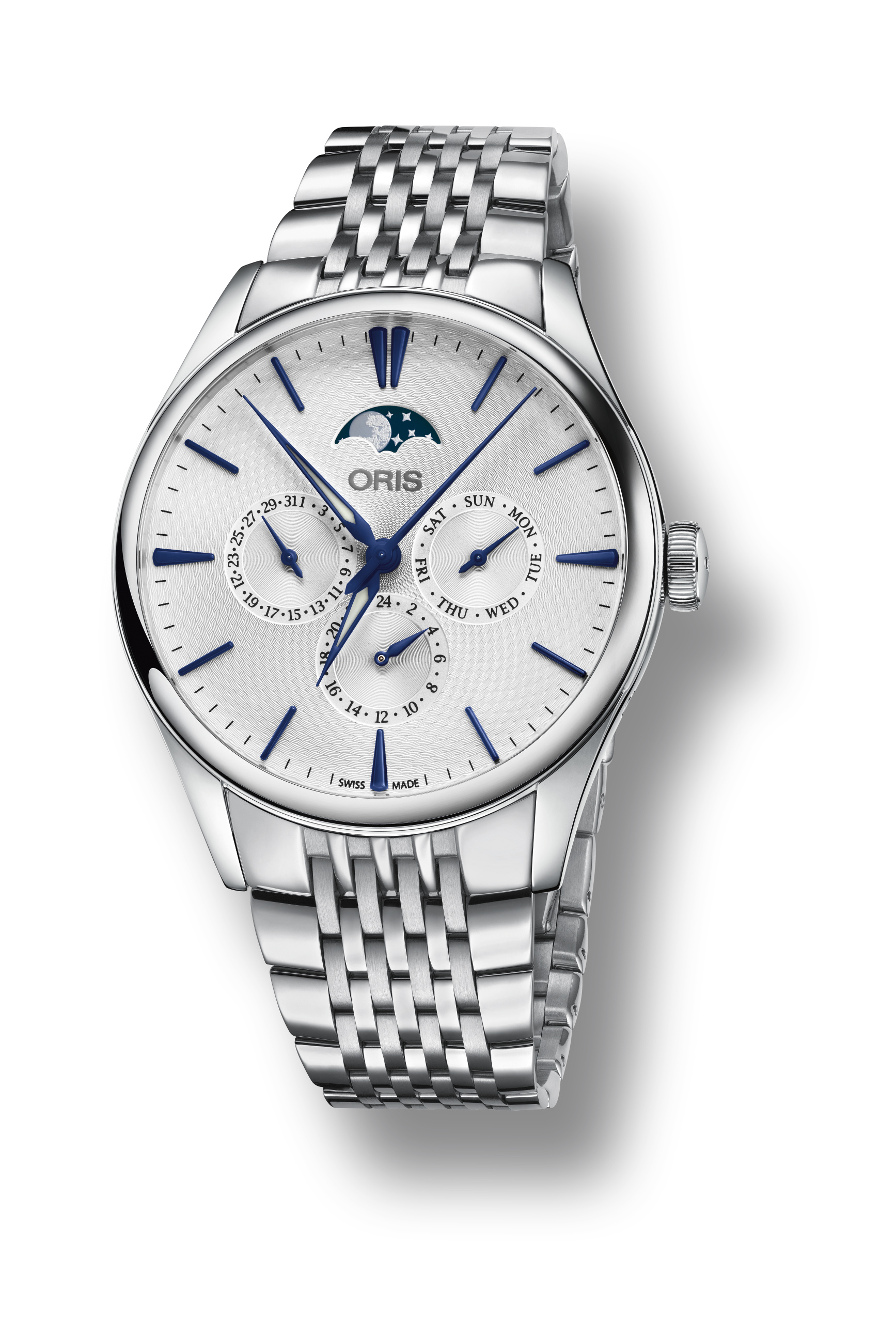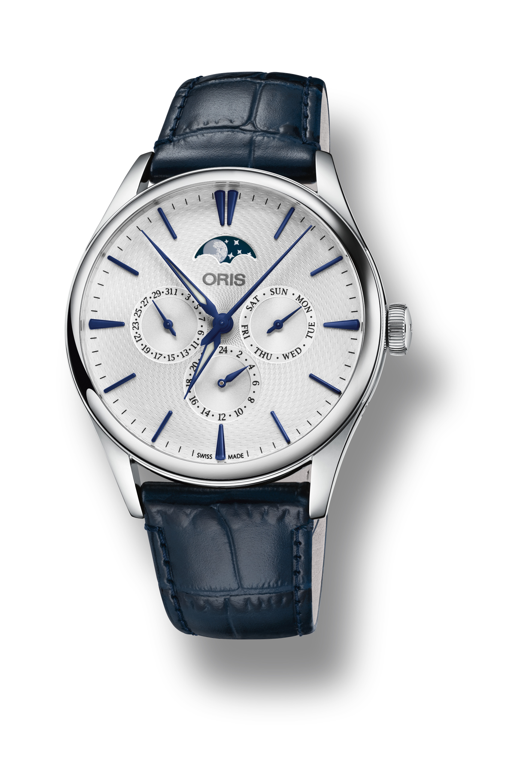 Deux versions, avec boîtier en acier inoxydable, sont disponibles : l’une avec aiguilles et index plaqué or rose, accompagnée d’un bracelet en cuir marron ; la seconde avec aiguilles des secondes et index bleus, agrémenté d’un bracelet en cuir bleu. Pour que ces nouvelles interprétations gardent le charme et l’originalité du modèle, les couleurs des phases de lune sont coordonnées au cadran. En adéquation avec la philosophie Oris, la montre a été conçue pour un usage quotidien. Le second fuseau horaire peut être ajusté rapidement via un correcteur situé à 4h, une fonction qui sera appréciée par les voyageurs.