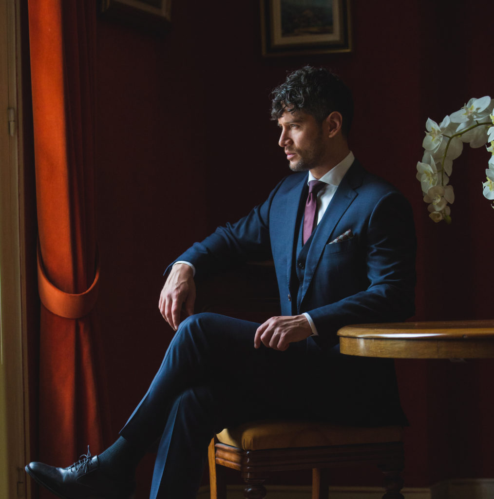 De l’allure pour ce mois de Mai avec un costume 3 pièces confectionné sur-mesure dans un tissu Fratelli Tallia Di Delfino, 130’s.