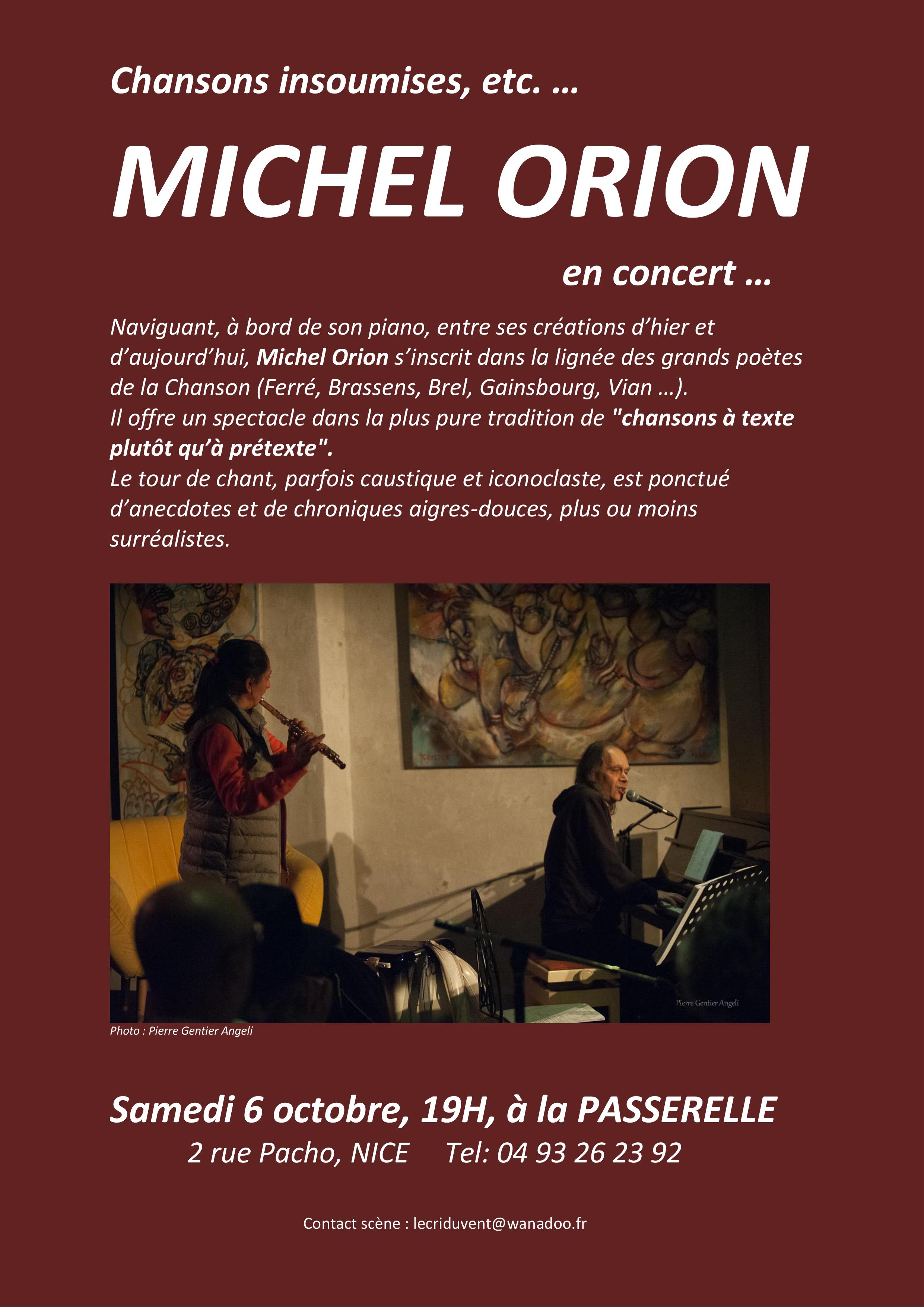 par admin25 septembre 201825 septembre 2018Laisser un commentaire sur MICHEL ORION : CONCERT EXCEPTIONNEL A NICE Si le cœur vous en dit, CONCERT EXCEPTIONNEL DE MICHEL ORION le Samedi 6 octobre à 19 h, à LA PASSERELLE, 2 rue Pacho (au port, à côté de l’église) à Nice.