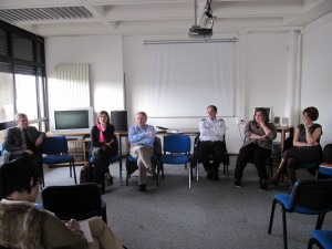 Participaient à cette interaction (de gauche à droite de la photo) Monsieur Constantini, proviseur du lycée Hutinel, Maître Dupetit-Evrard, Avocate pénaliste au Barreau de Grasse, entre autres, défense des mineurs, Michael Darras, Magistrat, Substitut du Procureur de la République en charge des mineurs, Capitaine Baujard, Commissariat de la Police Nationale de Cannes, Maud Guillemin Juriste de la SMAV (Service de Médiation et d’Aide aux Victimes), Céline Di Martino représentant l’Antenne de Justice de la Ville de Cannes, Françoise Gorenflot représentant la Ville de Cannes, en charge de la Mission Collège Lycée, Directrice de Cannes Université ( qui, une quinzaine de jours plus tôt avait préparé cette rencontre avec toutes les classes présentes).