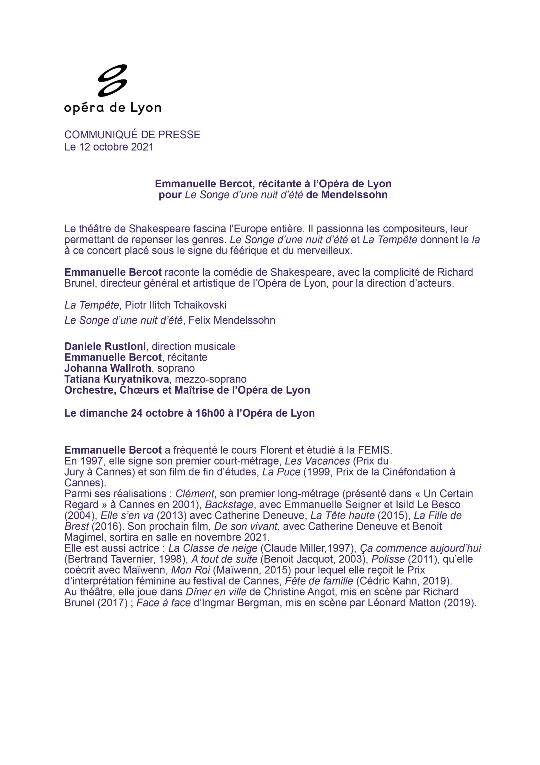 par admin13 octobre 202113 octobre 2021Laisser un commentaire sur Opéra de Lyon – « Le Songe d’une nuit d’été » de Mendelssohn avec Emmanuelle Bercot, récitante à l’Opéra de Lyon…
