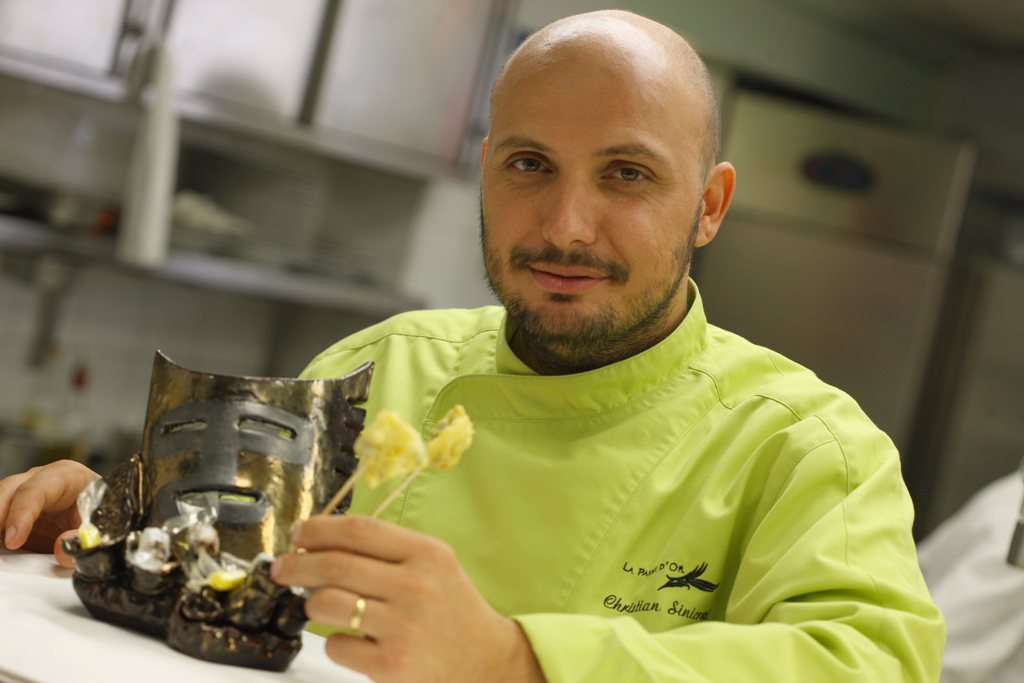 Christian Sinicropi, chef des cuisines du Martinez marque son style très poétique au menu du restaurant La Palme d’Or (2 étoiles). Enfant du pays, il met en scène des produits du terroir, les associe parfois de façon improbable… et le résultat est surprenant; jusqu’à la création des assiettes qu’il dessine pour être ensuite confectionnées par son épouse, formée à l’école des Beaux-Arts de Vallauris.