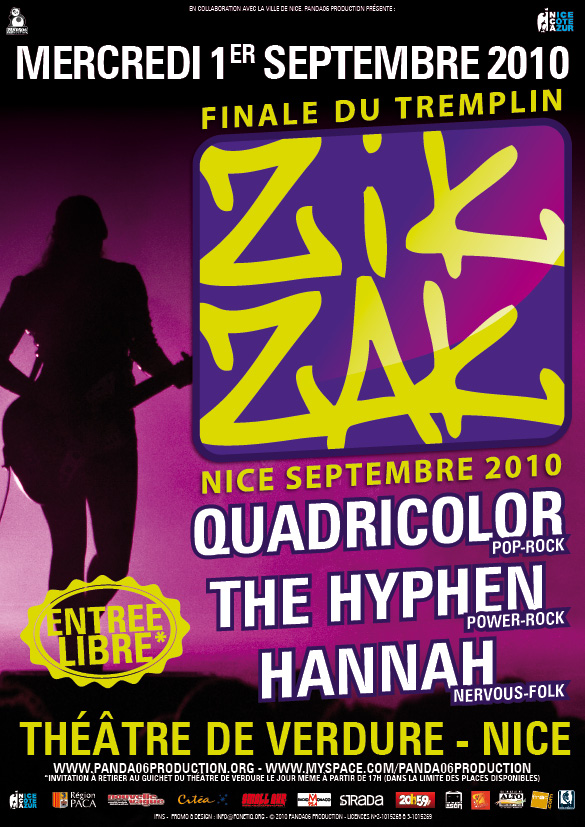 Trois groupes, trois formations, toutes niçoises, toutes appelées à conquérir les scènes les plus prestigieuses de France, d’Europe et pourquoi pas du monde ! Quadricolor, The Hyphen et Hannah sont les finalistes du tremplin Nice Zik Zak, retenus parmi plus de quarante candidatures pour leur talent, leur originalité et leur motivation. Après avoir passé le premier barrage des qualifications en décembre dernier, ils sont fin prêts à en découdre mercredi 1er septembre lors de ce grand final gratuit dans le chaudron du Théâtre de Verdure. C’est le public qui désignera le vainqueur du 1er Tremplin Nice Zik Zak par un vote à l’applaudimètre, les groupes auront donc besoin de la présence et du soutien de tous leurs fans et autres groupies !