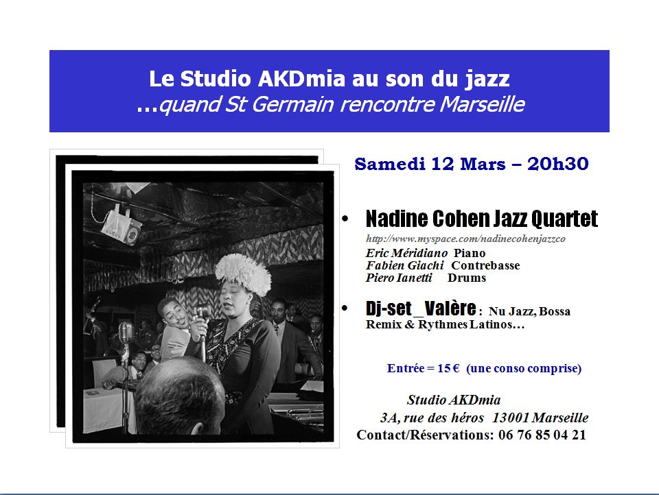 par admin25 février 201116 mars 2011Laisser un commentaire sur Marseille au Studio AKDmia : Soirée Concert Jazz Danse Swing Latino en compagnie de Nadine COHEN Quartet samedi 12 Mars 2011 à 20h30