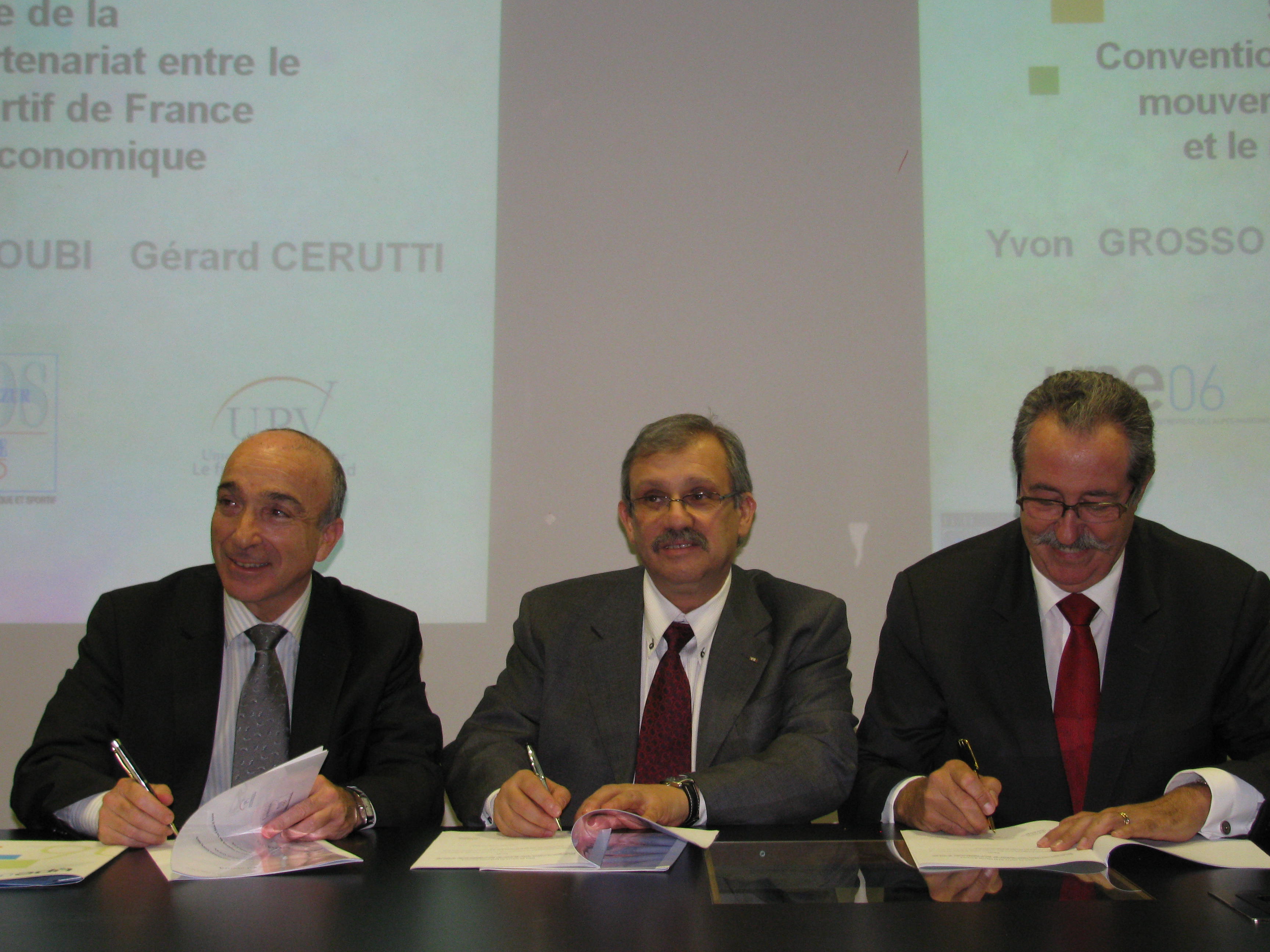 Jeudi 24 février 2011, accueillis dans les locaux de l’EDHEC Business School de Nice, par Bernard Curzi, directeur de l’ESPEME Groupe EDHEC, Yvon Grosso, Président de l’UPE 06, Gérard Cerutti, Président de l’Union pour l’Entreprise du Var (UPV) et Alain Koubi Président du Comité Régional Olympique et Sportif de la Côte d’Azur, ont signé une convention de partenariat exemplaire entre le monde du sport et les entreprises, en la présence exceptionnelle de Denis Masseglia, Président du Comité National Olympique et Sportif Français (CNOSF), de Philippe Joffard, Président du Comité National Sport du MEDEF, et de Pierre FONLUPT, Président de la Commission Nouveaux Dialogues du MEDEF.