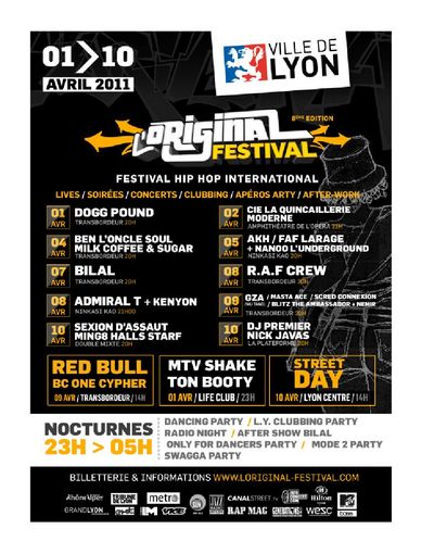 Le festival L’Original est, depuis 2004, un mélange de Danse, de Rap, de Dj, de Graffiti, de Beat Box et de Cinéma, qui a amené les plus grands artistes français et internationaux de chaque discipline (Kool Herc, Ice Cube, Beatnut, Mos Def, Busta Rhyme,Dj Quik, Method Man, Redman, De la Soul, Public Enemy, Bahamadia, Hezekiah, Mobb Deep, Guru, Oxmo Puccino, La Rumeur, Triptik, Wax Tailor, Hocus Pocus, Casey, La Cliqua, Pockemon, Wagabonds, Wanted, Smockemon, Brusk, Dj Fly, Dj Fab, Dee Nasty, Kosh, Eclipse, David X…) dans des lieux mythiques de Lyon (Transbordeur, Ninkasi Kao, Astroballe, Musée d’Art Moderne et Contemporain, Galerie des Terreaux, UGC Ciné Cité…) et uniques (La Plateforme, La Marquise, Epicerie Moderne…).